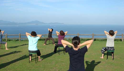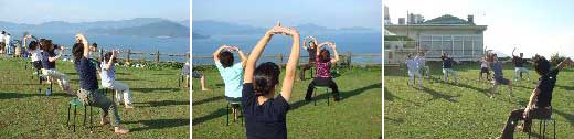 <もりや>のうどんがまだ存在するお腹の中に<山田家>のうどんを入れ込んで、さすがに眠くなったのか、その後のうどんバスは相当静かだったらしいですが、目的地・大串半島に到着。ここって日本?と思わせるような、絶景にしばし見とれつつ、その後は翌日の伝生ダンスで汗を流し、一番の目的である青空ジャイロを行いました。